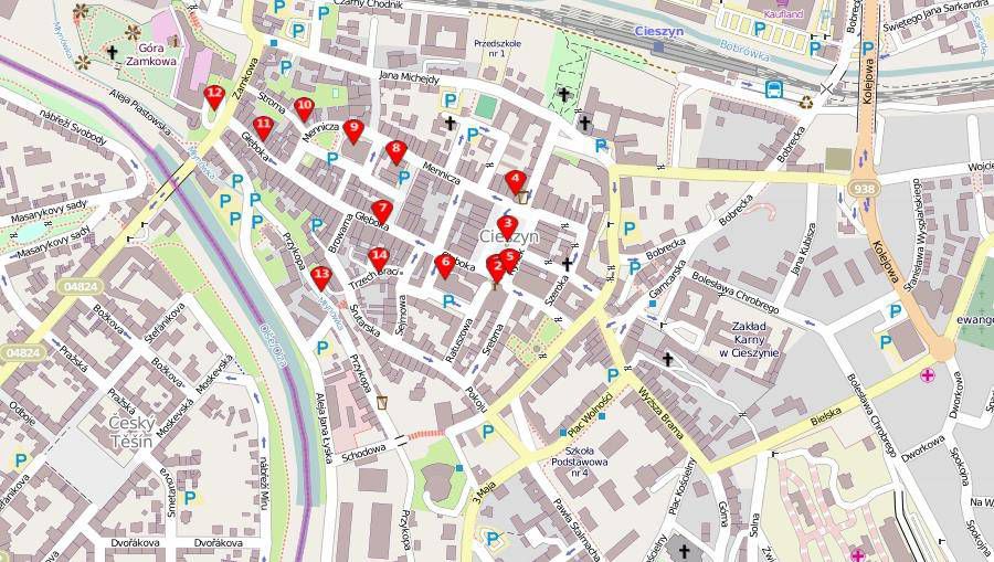 Możesz wybrać krótki spacer po centrum Cieszyna. Albo zdecydować się na dłuższą wycieczkę w cieszynie. Ta mapa pomoże Ci dotrzeć do najważniejszych miejsc.